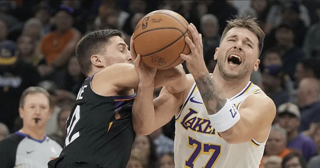 次节回来,古德温接球三分命中后伊戈达罗急停跳投再中,太阳领先到8分。艾顿转身干拔中距离得手,接着抢断后快下完成双手暴扣,斯马特送出纵贯全场的精准长传,助攻詹姆斯碾进内线轻松打进,湖人一波流将分差缩小至2分,打停太阳。奥尼尔三分再中止血,詹姆斯持球险些被抢断,自己拿住球飞身上篮命中,狄龙与拉拉维亚倒地拼抢地板球,湖人最后喊下暂停拿到球权。詹姆斯进攻中撞倒狄龙,裁判吹罚进攻犯规,回看后并没有升级,布克迎着东契奇上演高难度后仰中投,命中后还有加罚,东契奇连续失误,狄龙反击一条龙打进,太阳重新领先到8分。八村塁接球三分止血,詹姆斯连续造犯规走上罚球线,半场战罢,湖人62-62追平太阳。